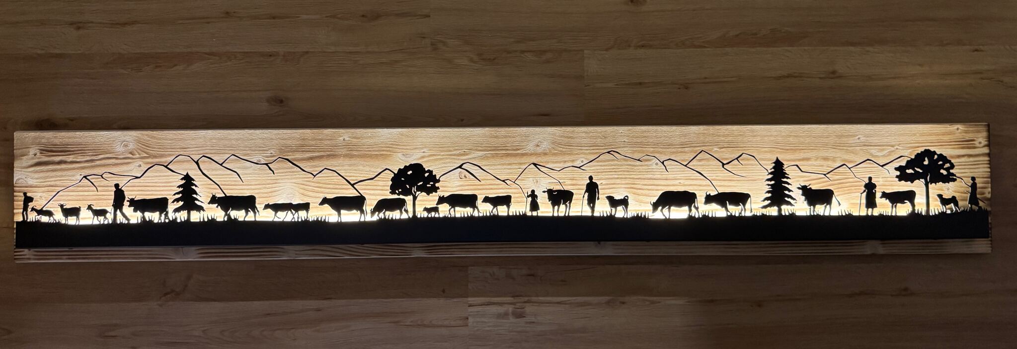 Bild beleuchtet 185cm mit Silhouette Alpabzug mit Gebirge 29 Figuren auf Holz