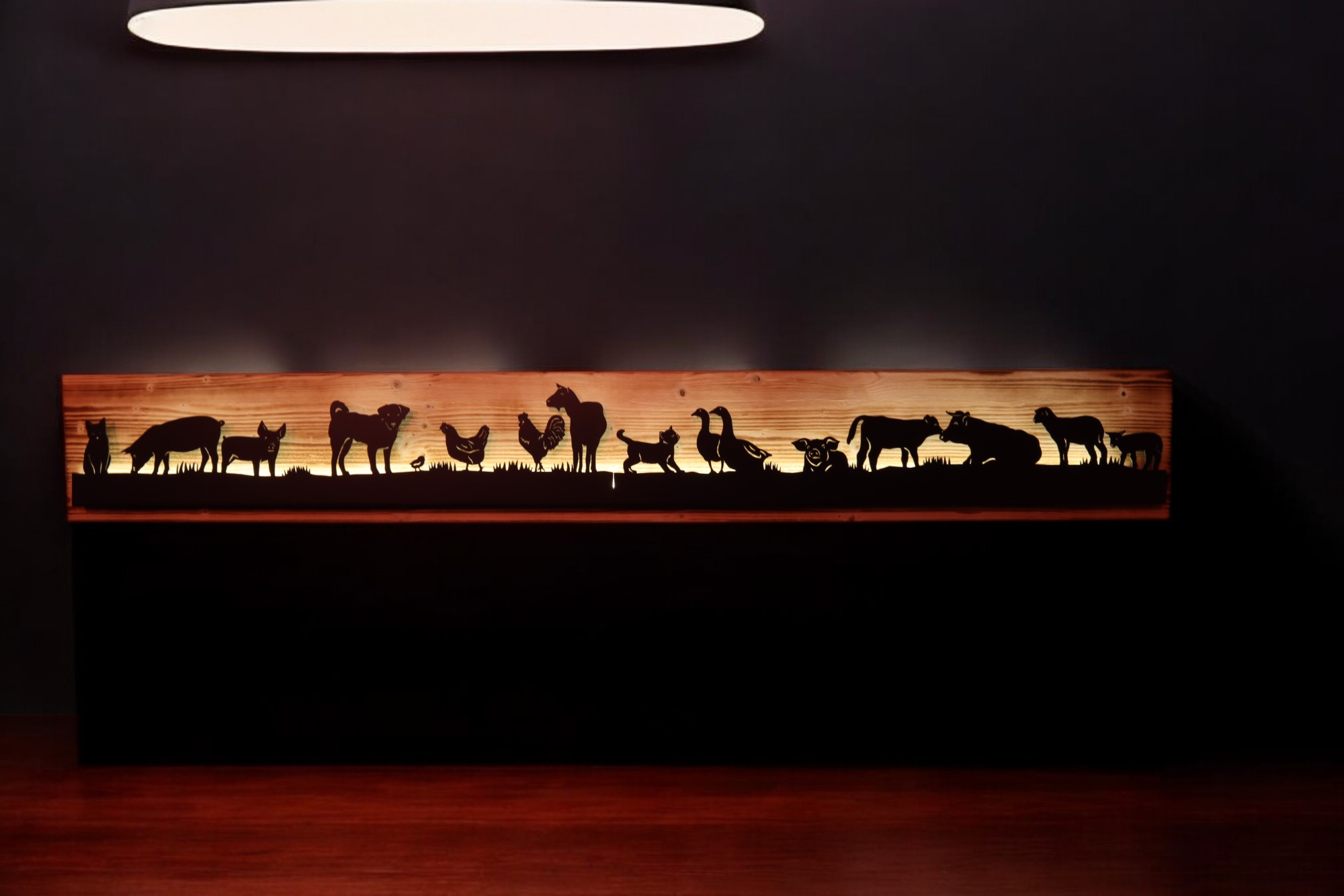 Bild beleuchtet 185cm mit Silhouette Bauernhoftiere auf Holz