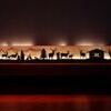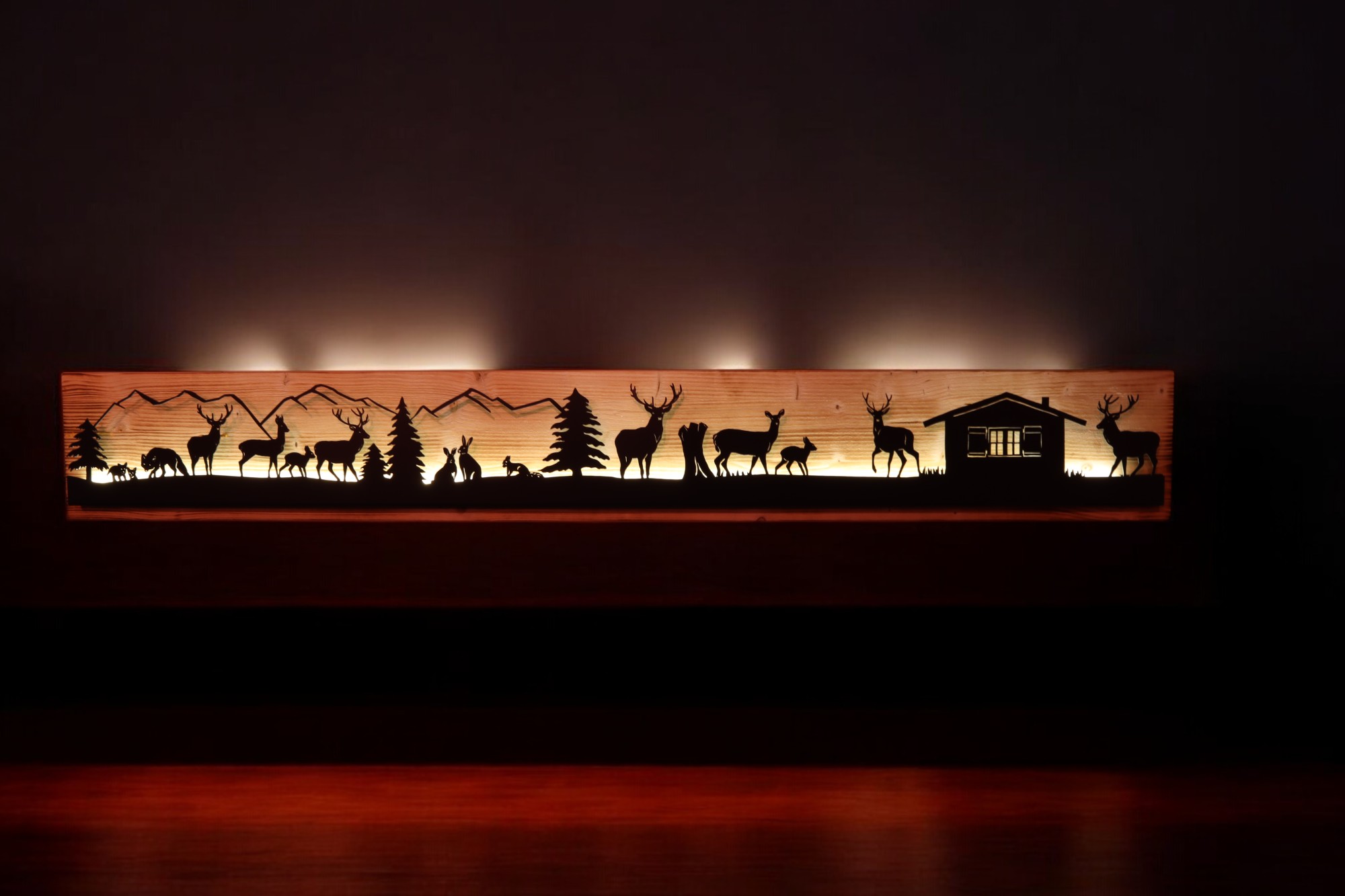 Bild beleuchtet 185cm mit Silhouette Hirsch Wald Haus Berge auf Holz