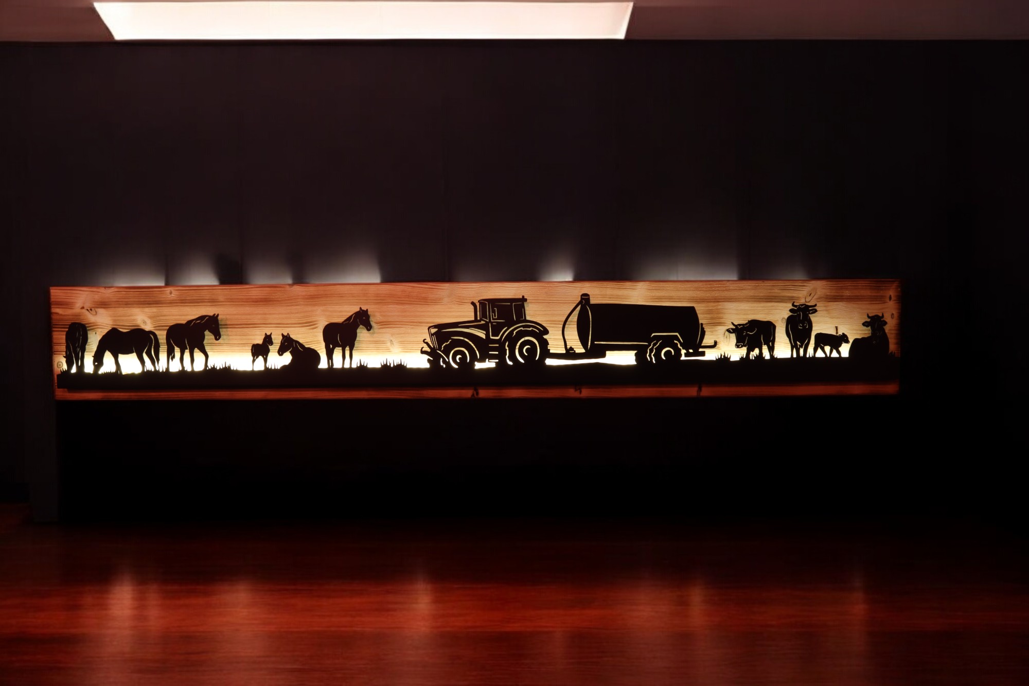Bild beleuchtet 185cm mit Silhouette Pferde Traktor und Kühe auf Holz