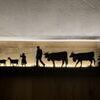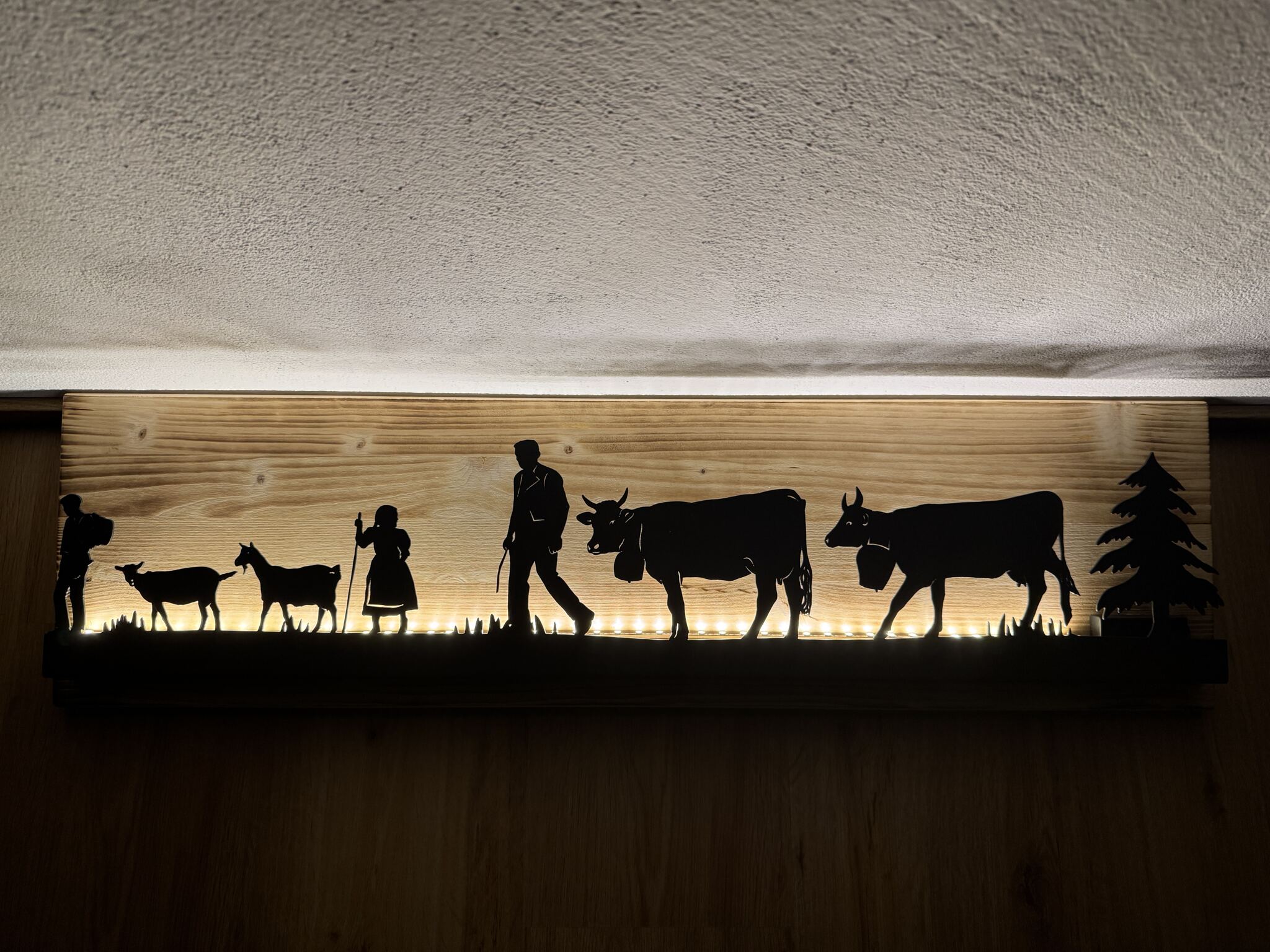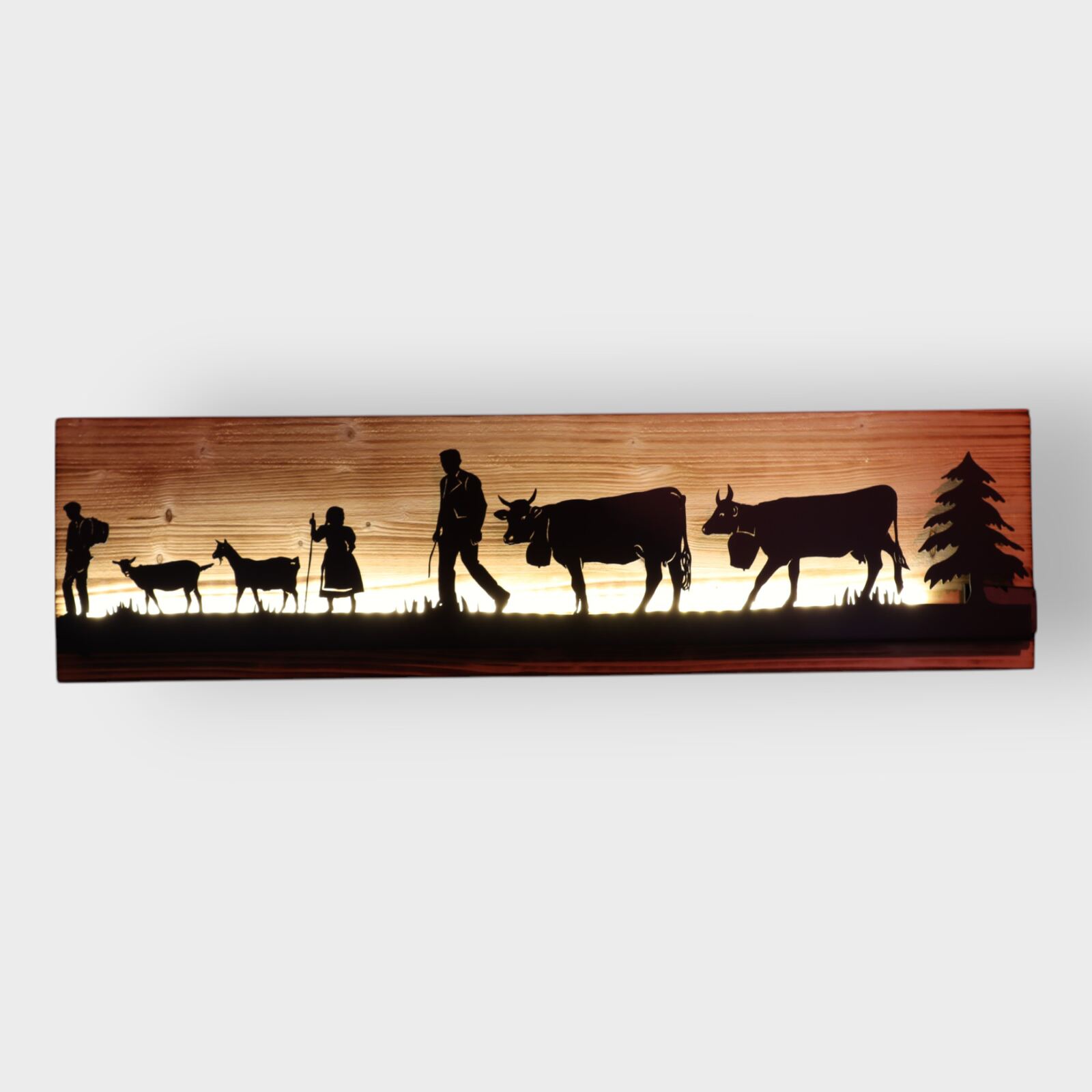 Bild beleuchtet 92 cm mit Silhouette Alpabzug / Alpaufzug Anfang auf Holz