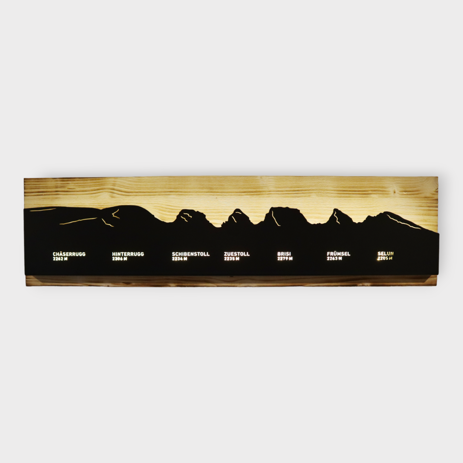 Bild beleuchtet 92 cm mit Silhouette Churfirsten Toggenburger Seite auf Holz