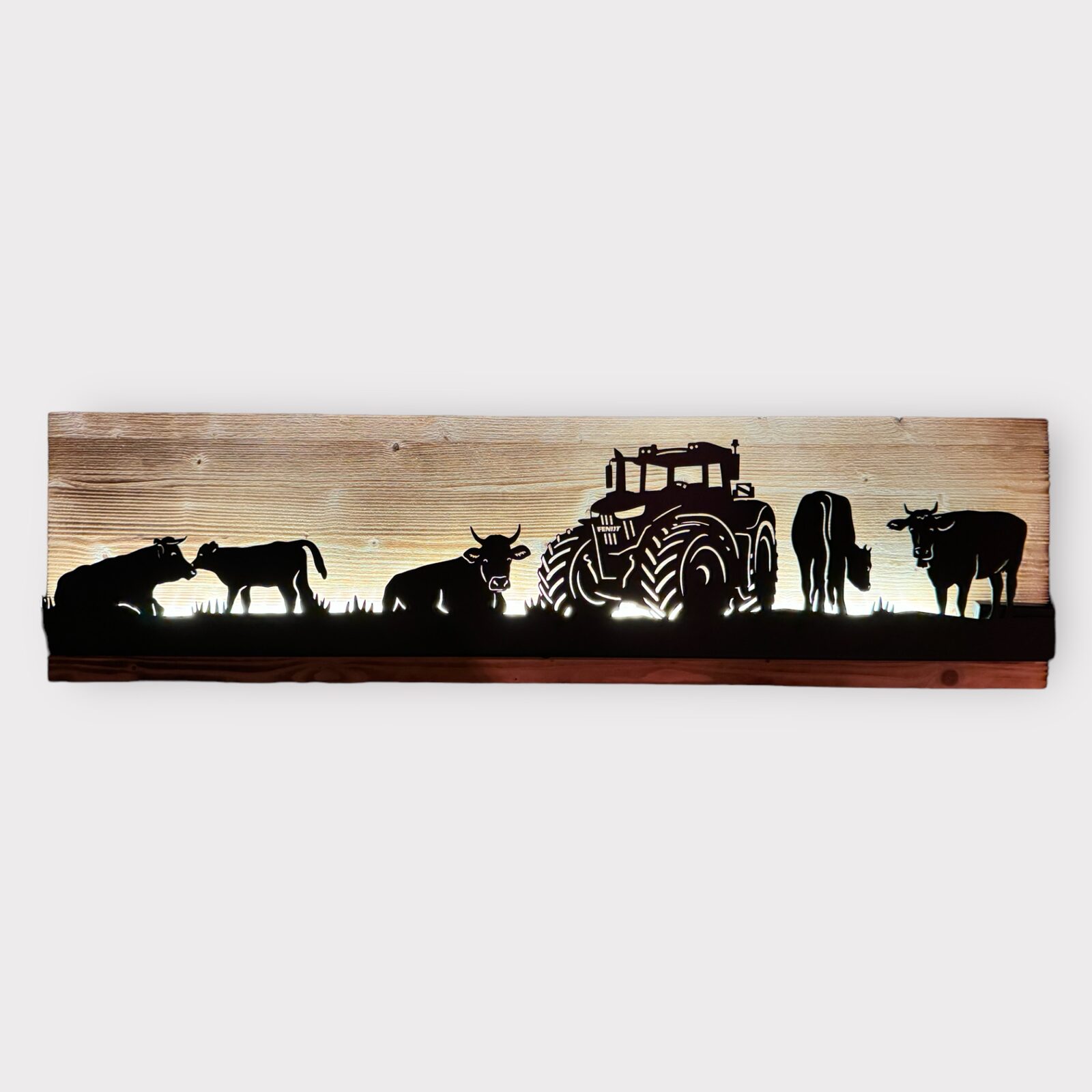 Bild beleuchtet 92 cm mit Silhouette Fendt Traktor und Kühen auf Holz