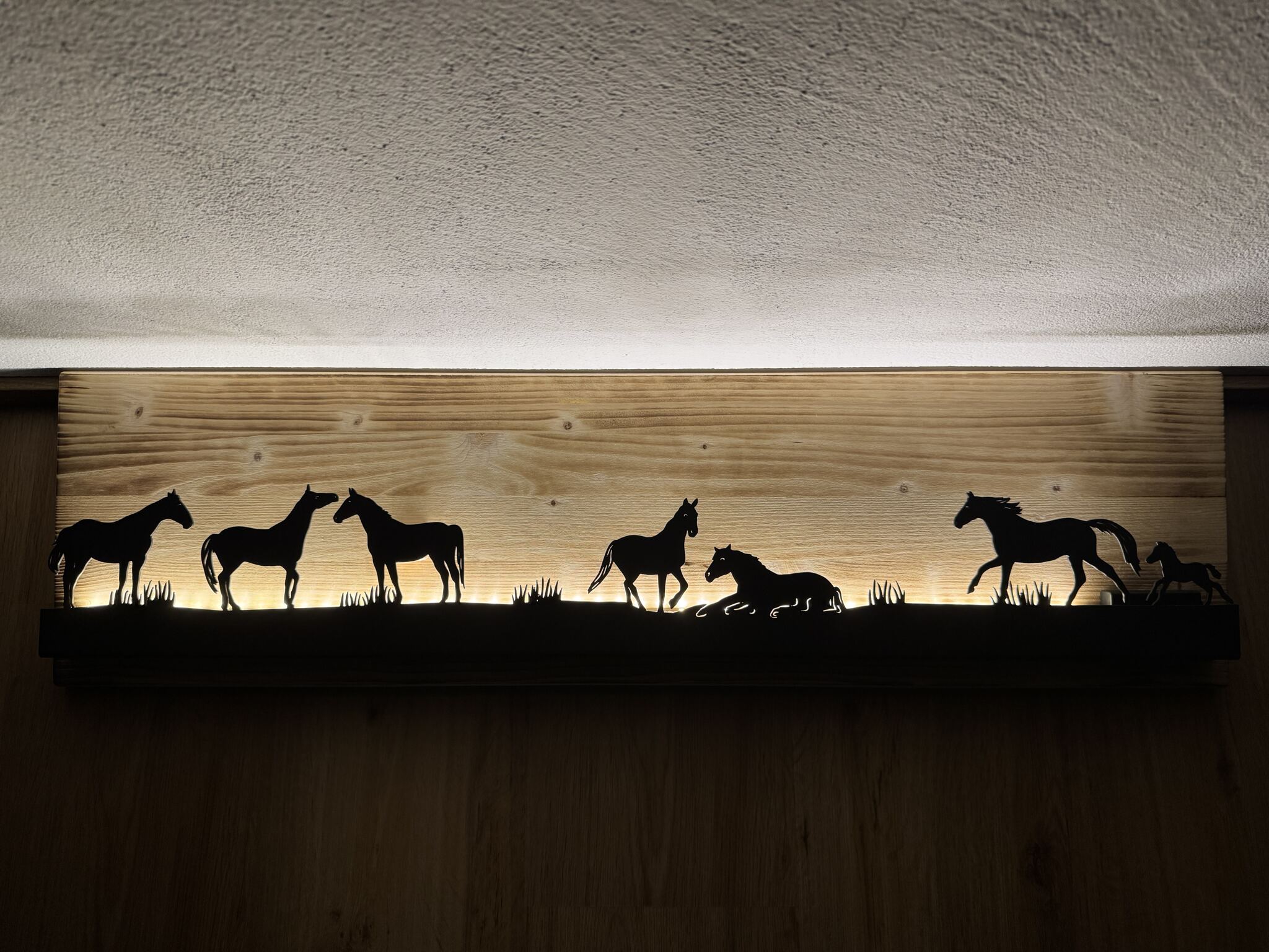 Bild beleuchtet 92 cm mit Silhouette Pferde auf Holz