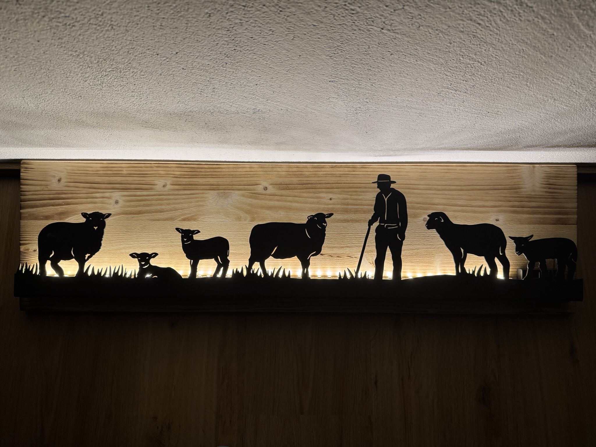 Bild beleuchtet 92 cm mit Silhouette Schafe Teil 1 auf Holz