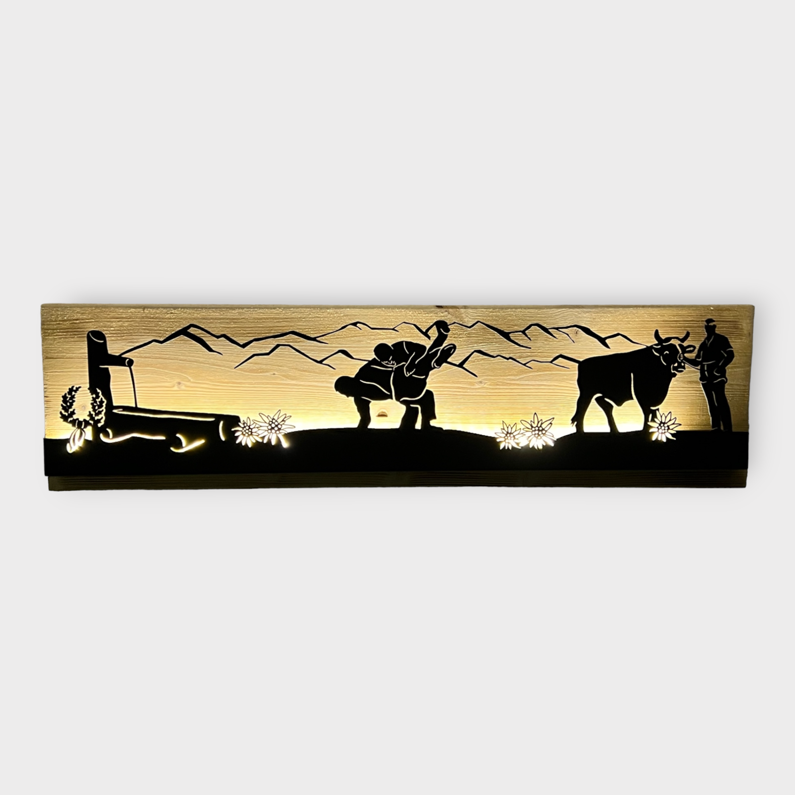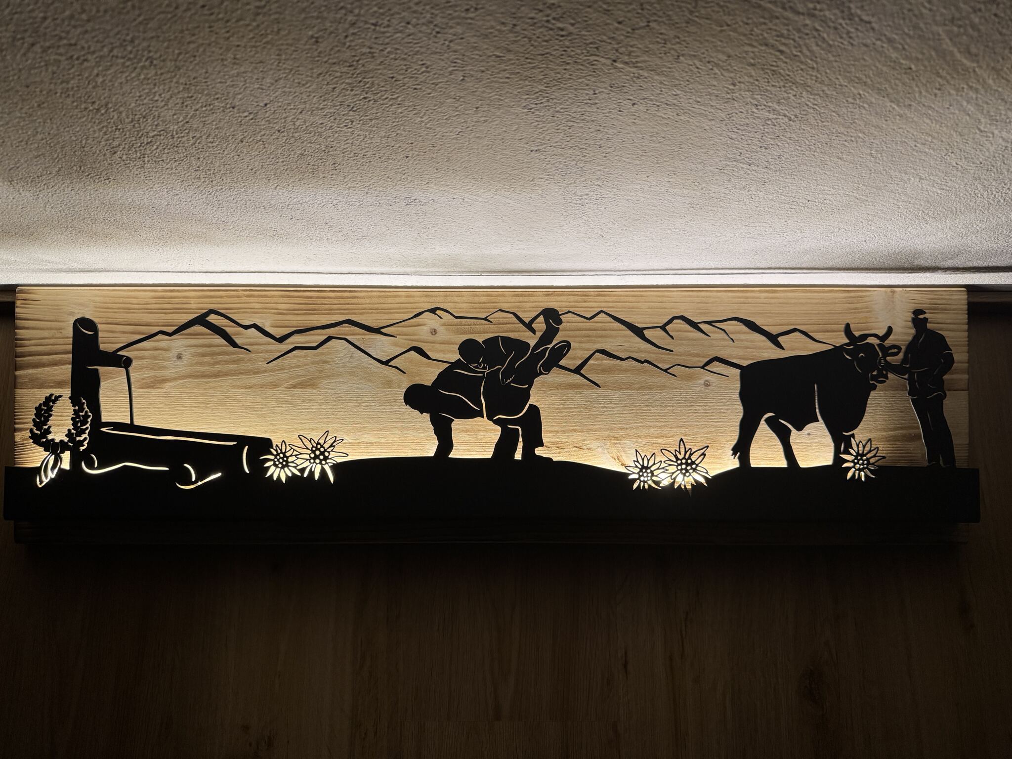 Bild beleuchtet 92 cm mit Silhouette Schwingfest Teil 1 auf Holz