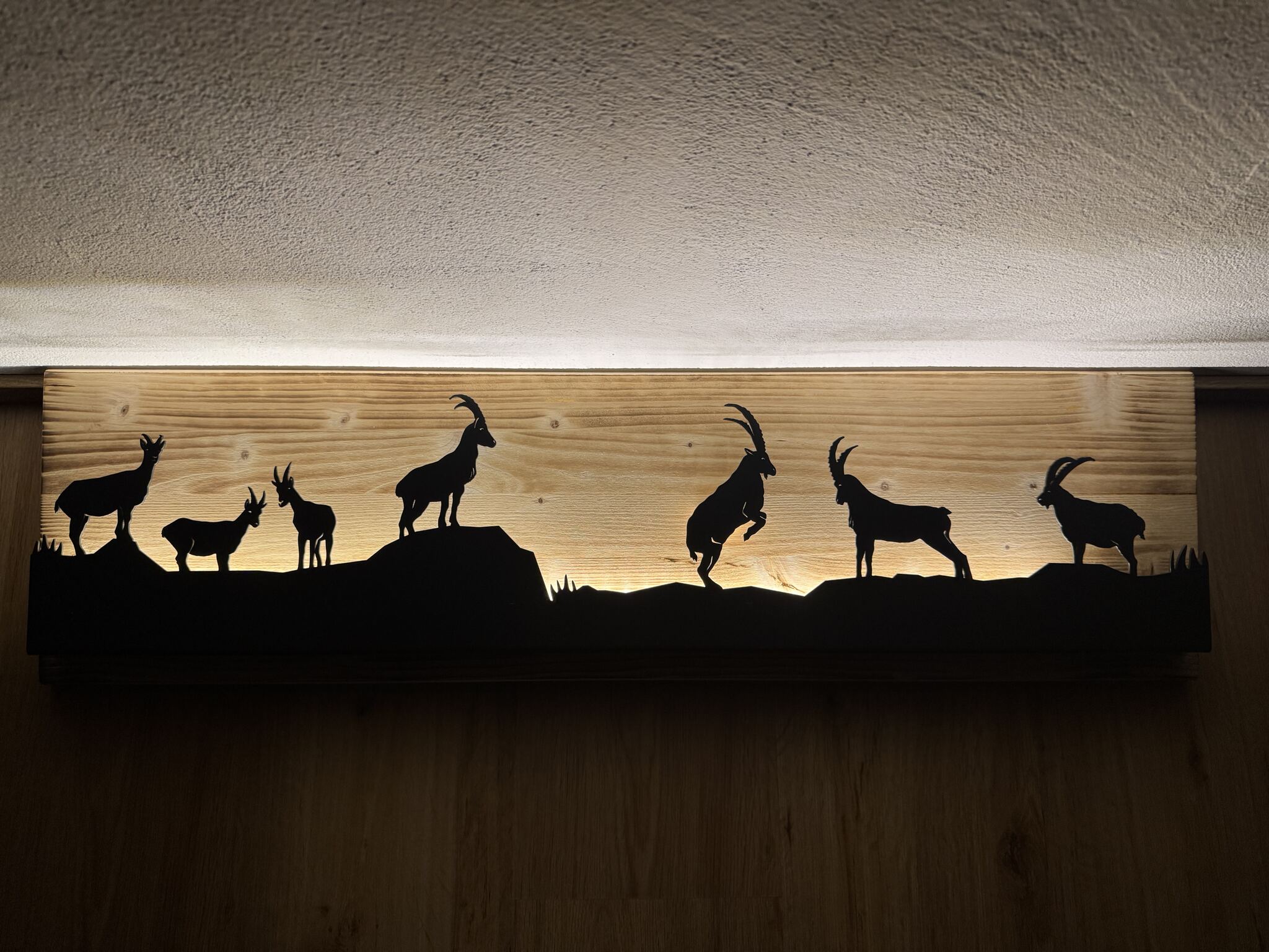 Bild beleuchtet 92 cm mit Silhouette Steinbock Teil 2 auf Holz