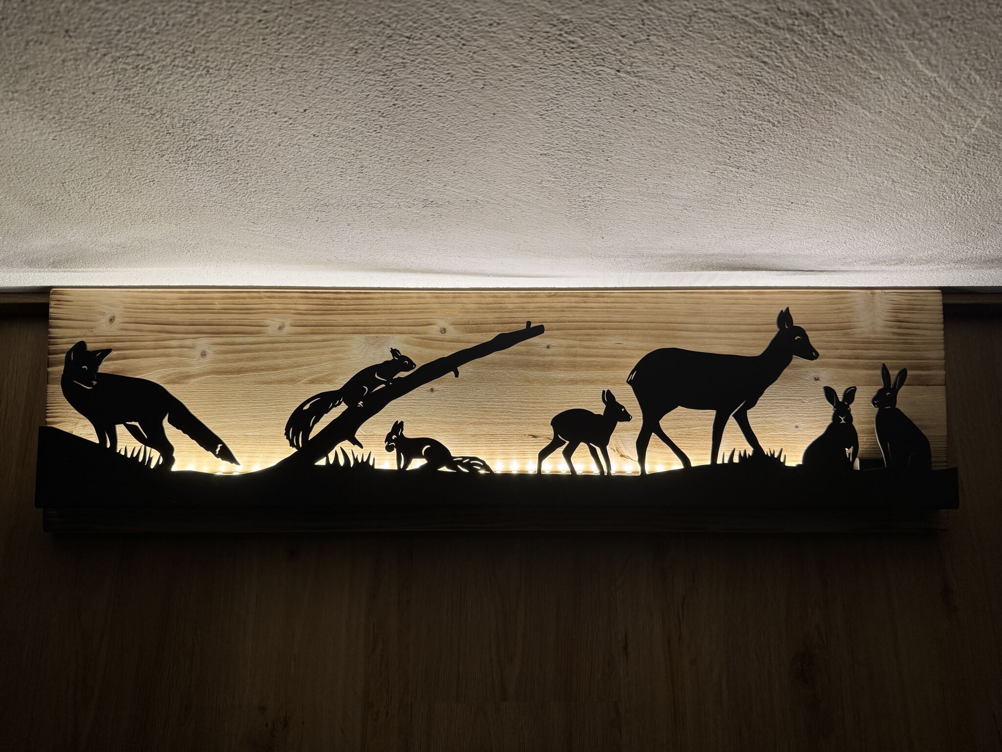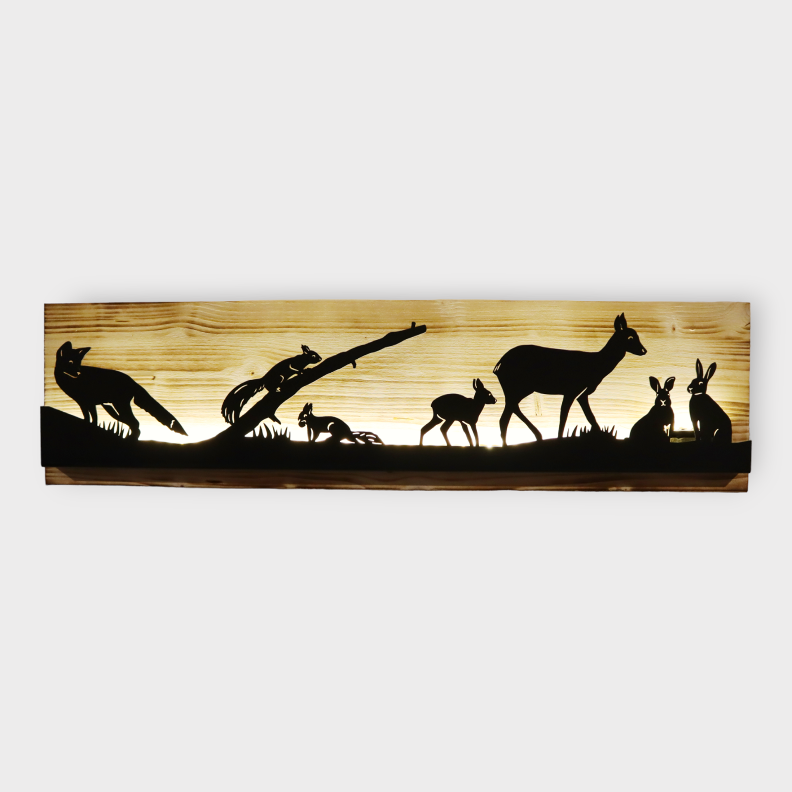 Bild beleuchtet 92 cm mit Silhouette Waldtiere auf Holz