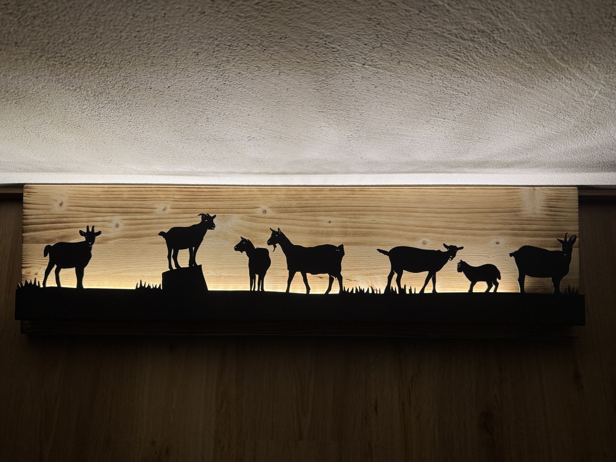 Bild beleuchtet 92 cm mit Silhouette Ziegen Teil 1 auf Holz