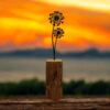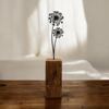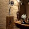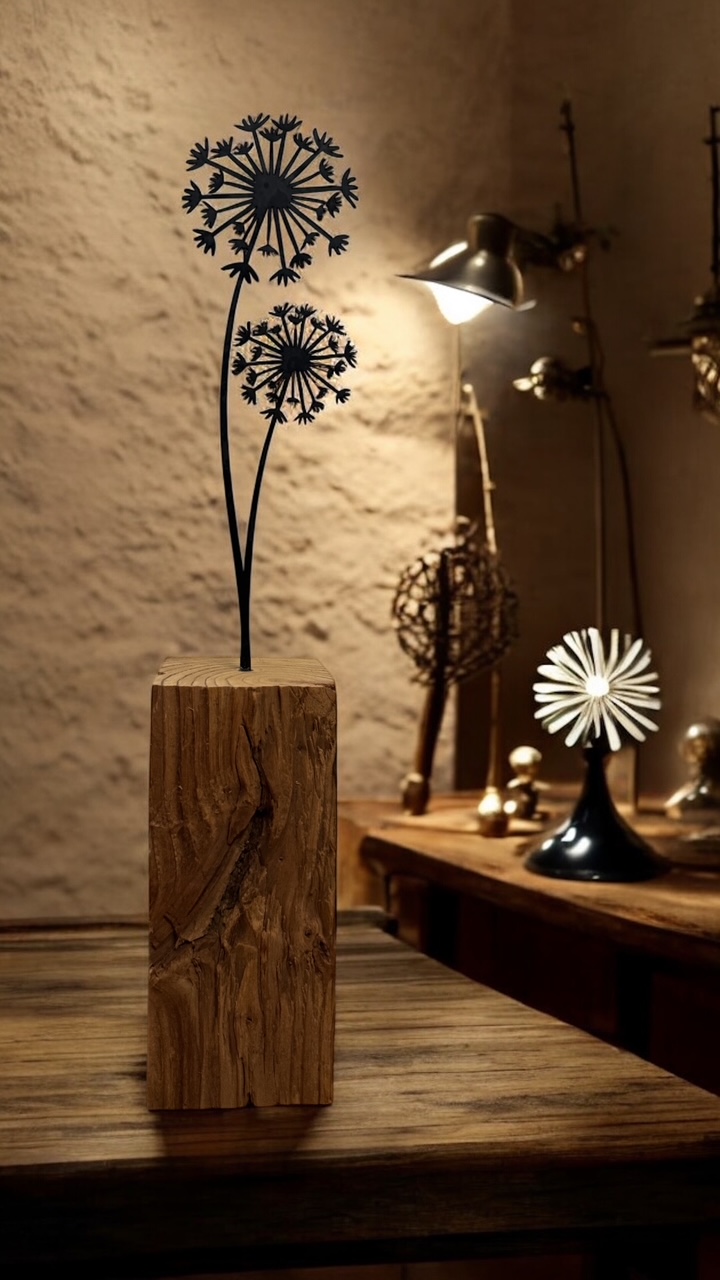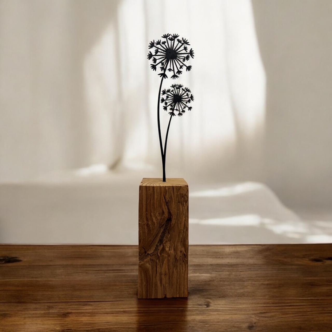 Die Gesamthöhe beträgt ca. 55cm, Der Altholzbalken hat den Querschnitt 13cm. Die Pusteblume ist aus Blech und beschichtet.