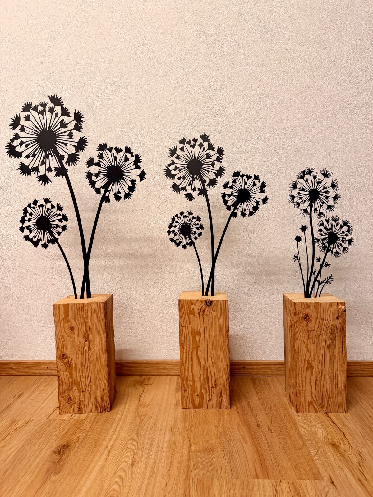 Die Gesamthöhe beträgt ca. 50cm, Der Altholzbalken hat den Querschnitt 13cm. Die Pusteblume ist aus Blech und beschichtet.