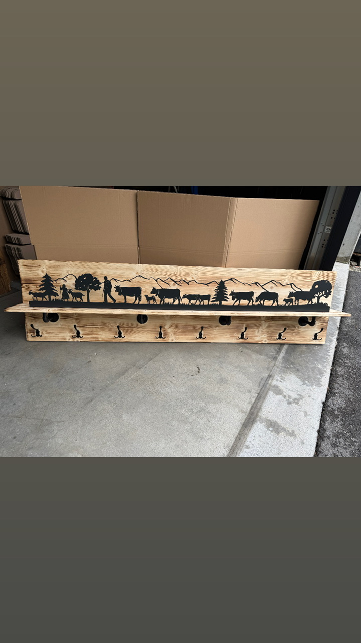 Die Garderobe hat eine Länge von 200cm, Höhe 50cm und Tiefe 20cm. Die Silhouette kann frei gewählt werden. Mit Hintergrund Beleuchtung.