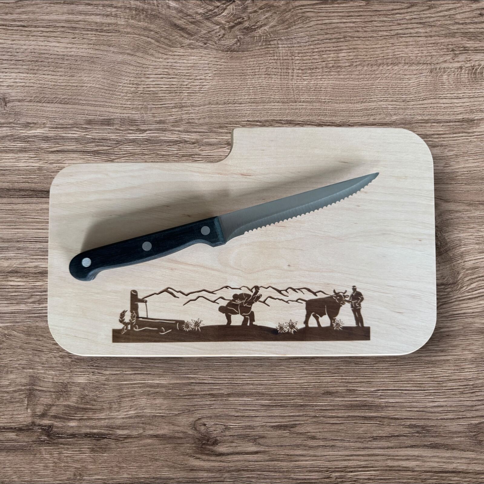 Holzbrettli mit Messer zum Vesper. Ideale Grösse 26 x 16 cm in den Rucksack, Schwingfest oder Zuhause.
