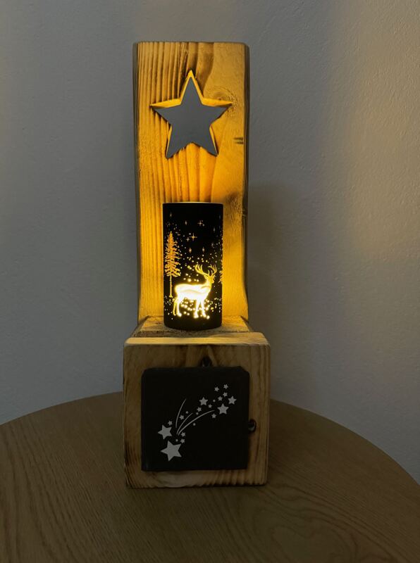 Die Höhe beträgt ca. 45cm, Schieferplättli 10x10cm mit Sternen. Das Windlicht ist aus Glas.