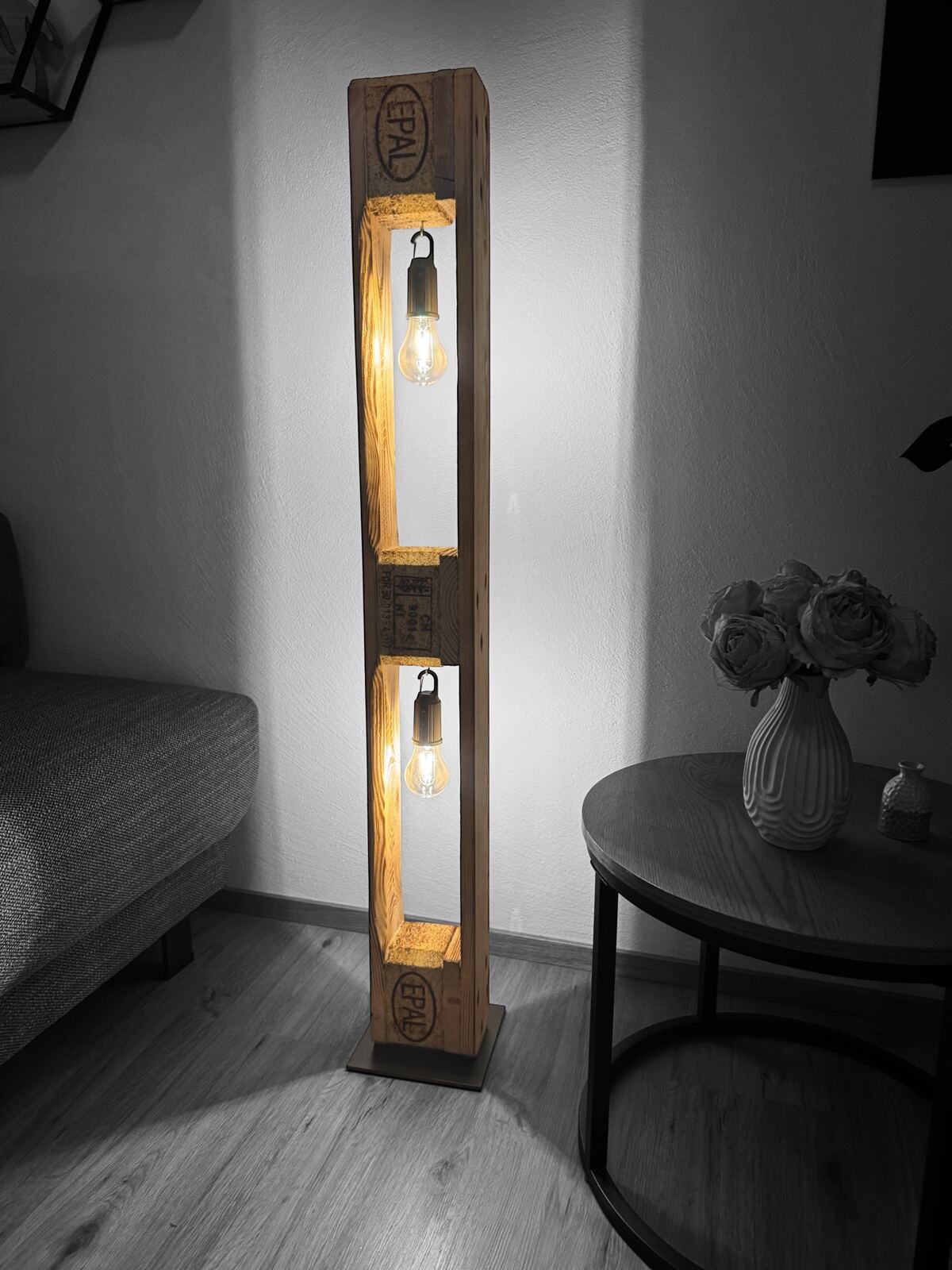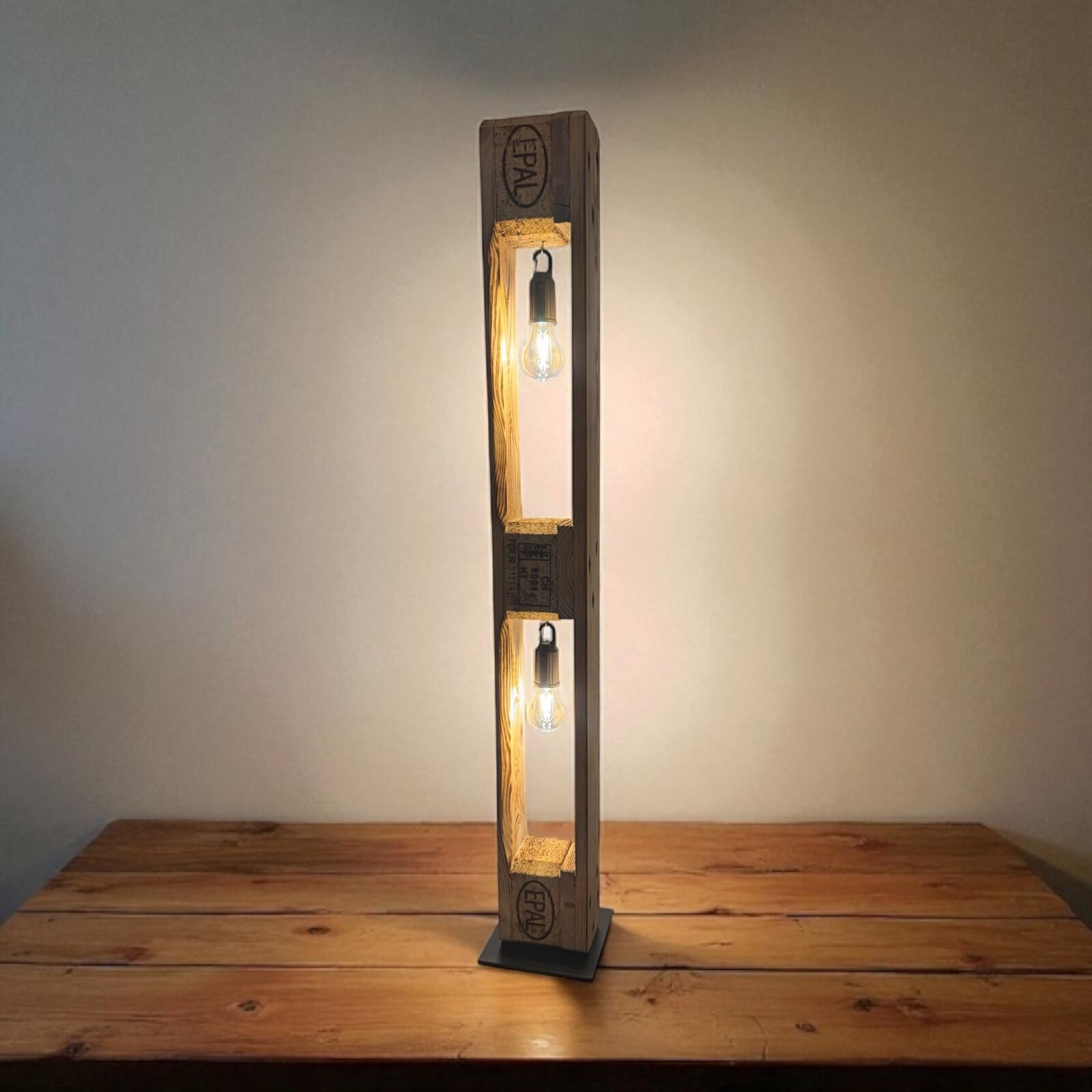 Palettenträger 120cm Höhe. Eisenfuss ist Pulverbeschichtet und mit Filz bestückt. Träger Glühbirne LED mit USB+ Buchse