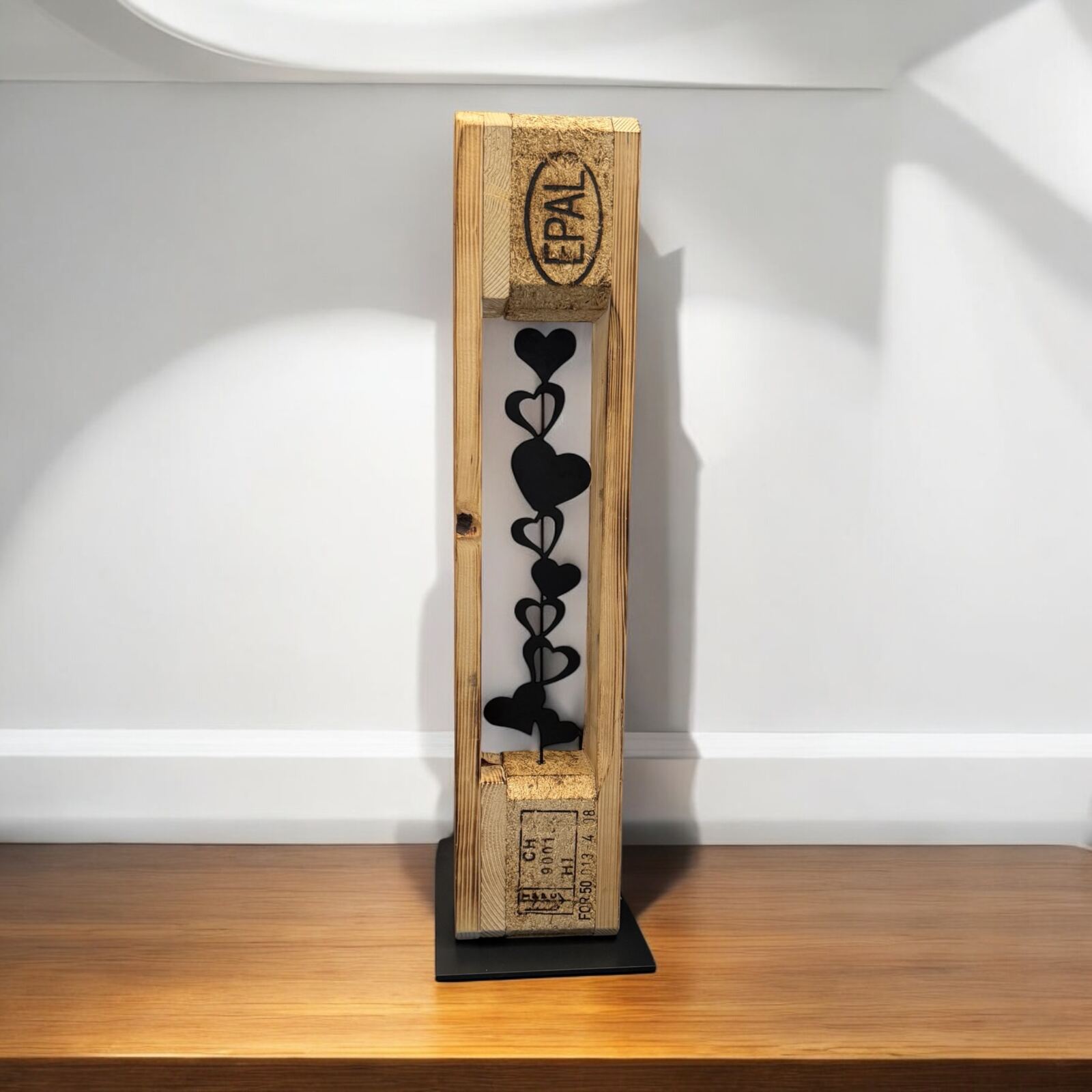 Palettenträger mit Herzen. Gesamthöhe 70cm, die Herzen sind aus Eisenblech.